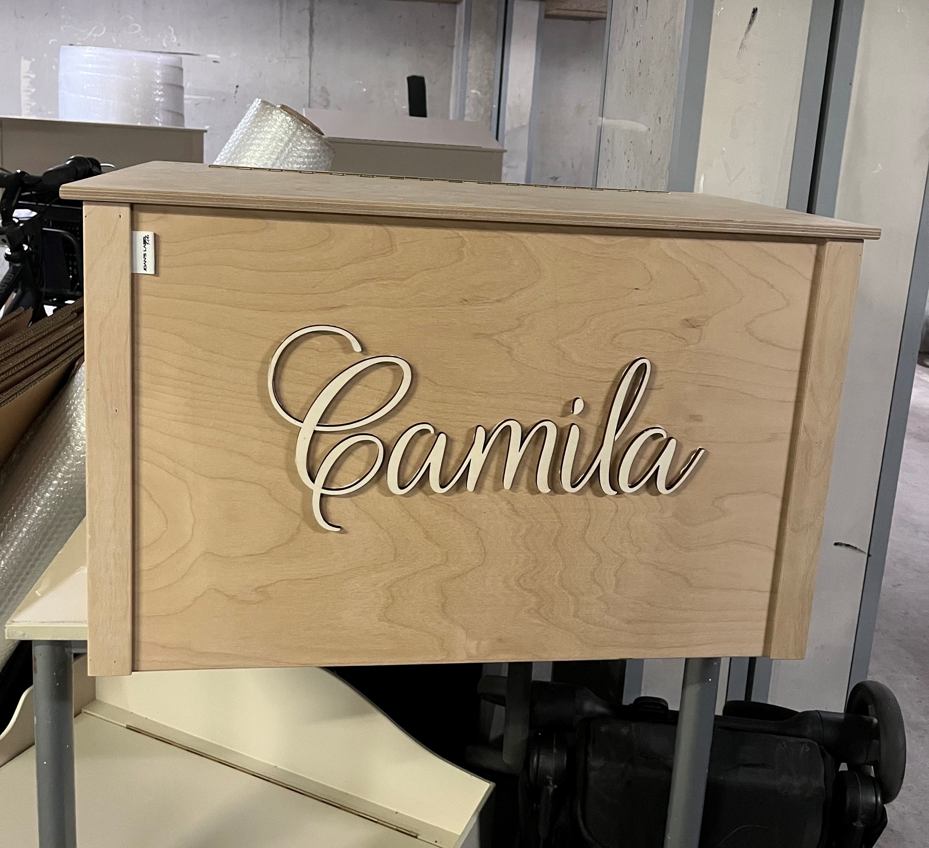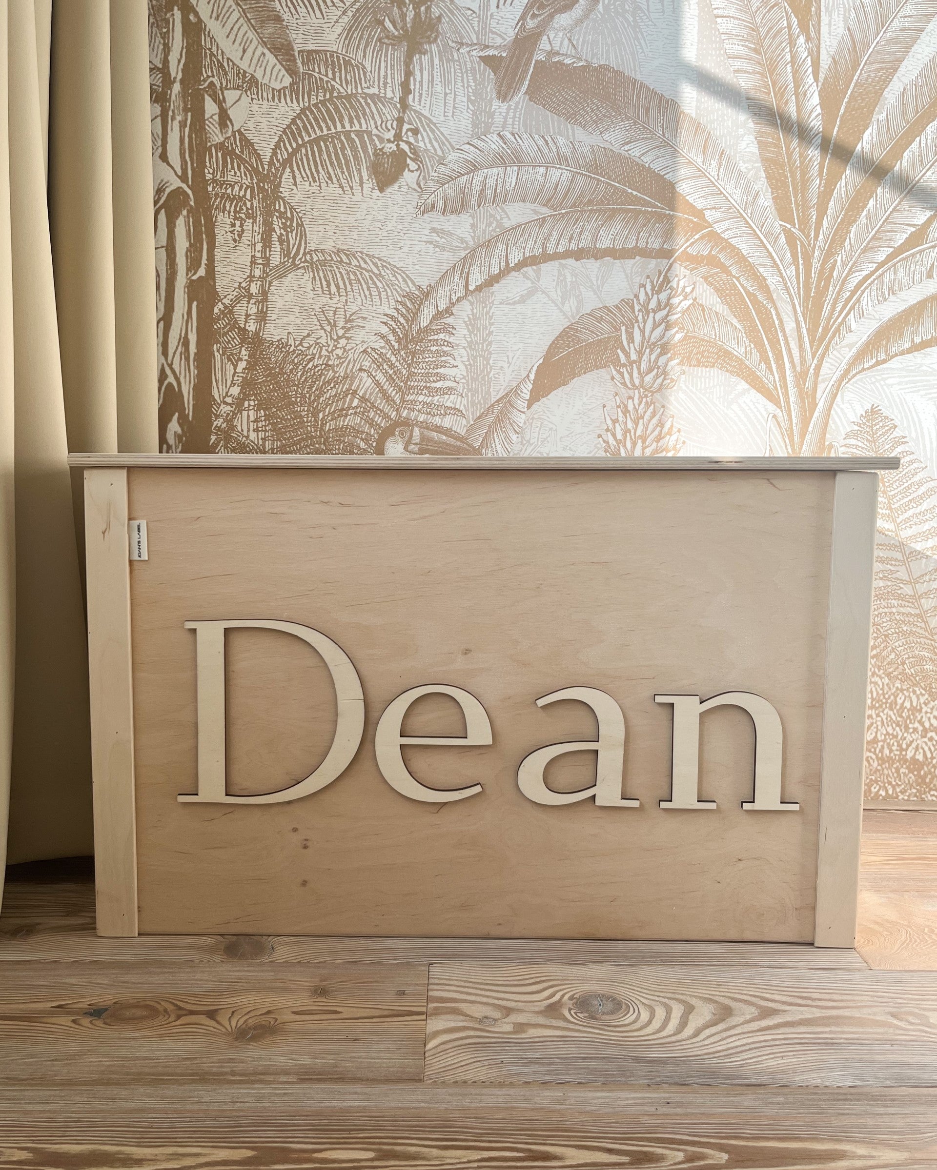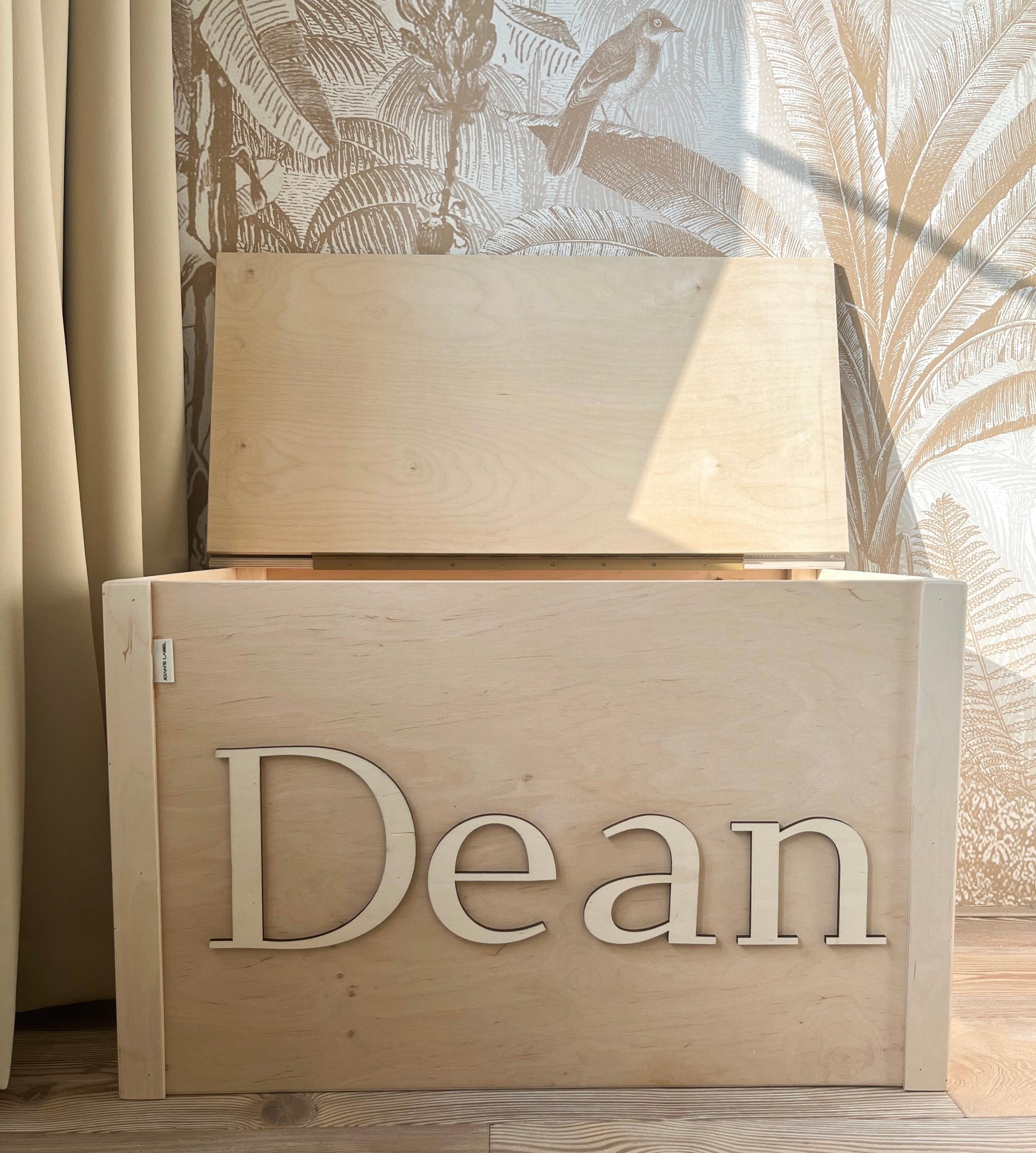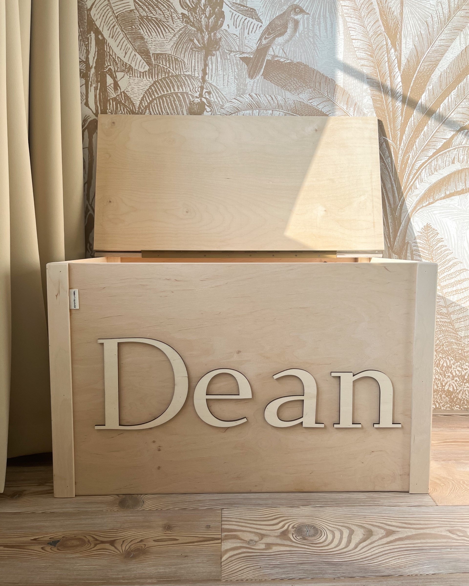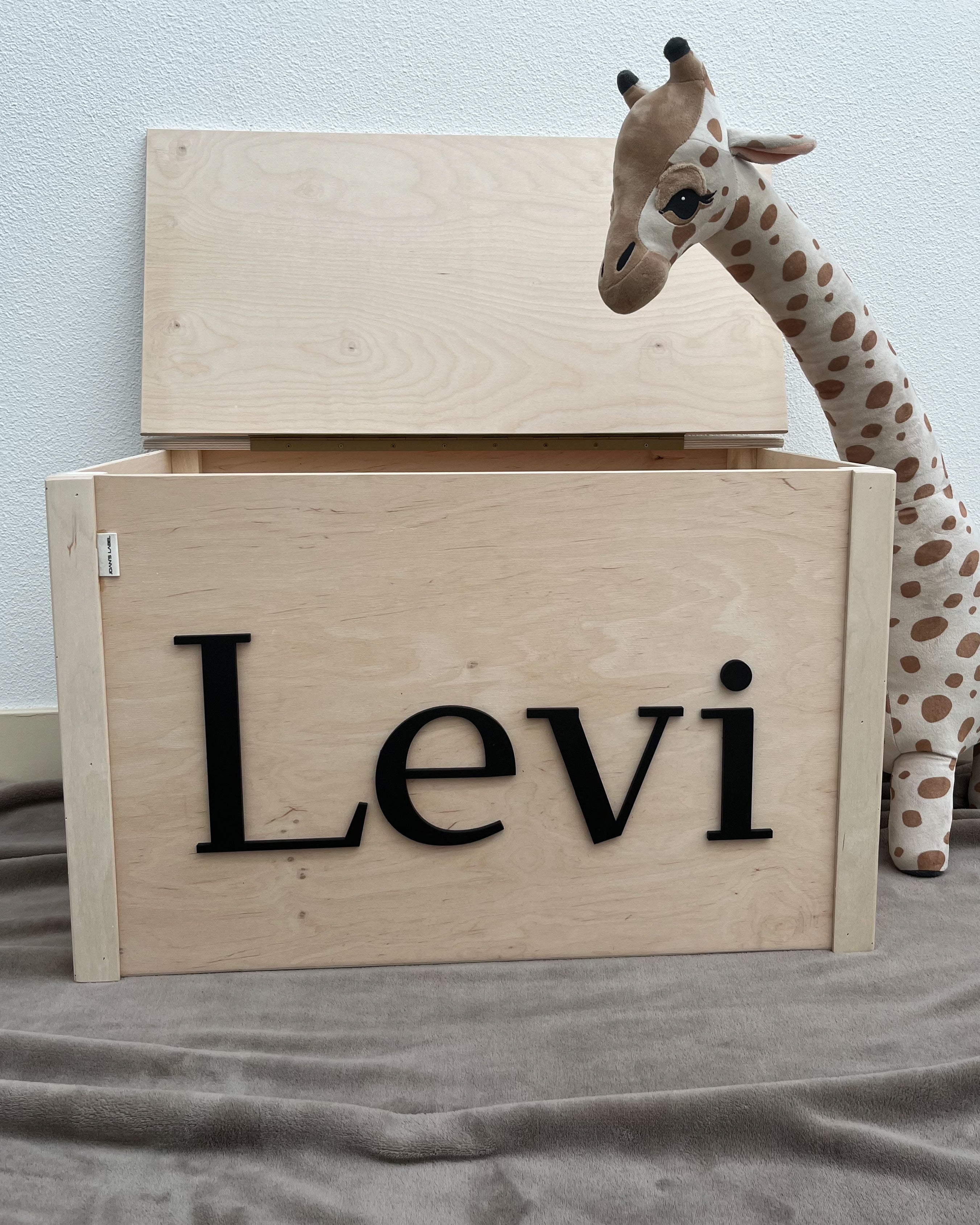 Dit is de originele houtlook variant (dus niet geverfd), maar deze is ook verkrijgbaar in vier bewerkte varianten en kleuren. De naam van jouw kleine komt er in het gewenste lettertype en kleur (wanneer gewenst) in 3D letters op. De deksel van de speelgoedkist kan HELEMAAL geopend worden, stuk veiliger tijdens het spelen!